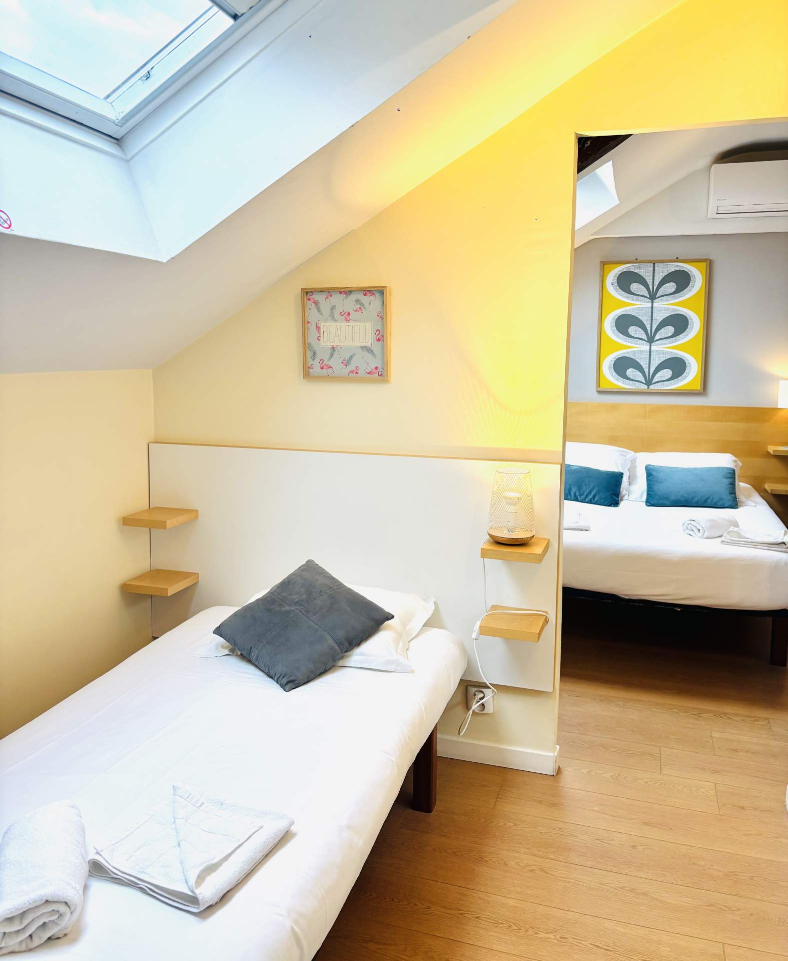 In a space of approximately 30m², this family room ensures comfort for everyone. Equipped with a large double bed, two bunk beds, and a bathroom, it is ideal for a family of 3 or 4 people.